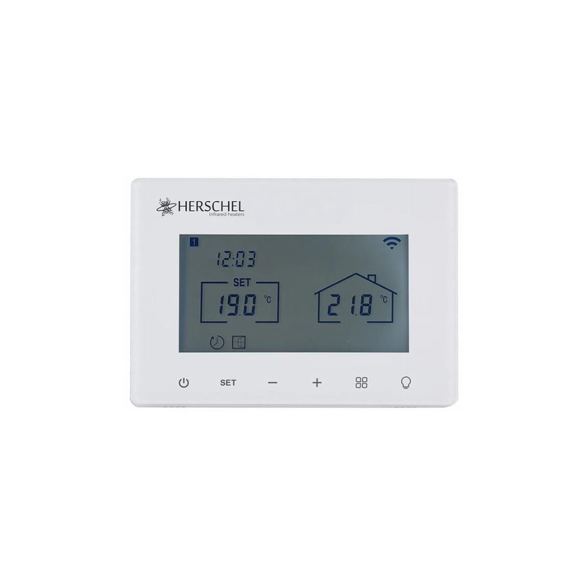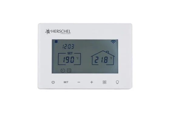 Herschel T-MTLED è un termostato compatto alimentato dalla rete elettrica, progettato per funzionare esclusivamente con i termoconvettori a LED Herschel dotati di ricevitore SMART-R integrato.