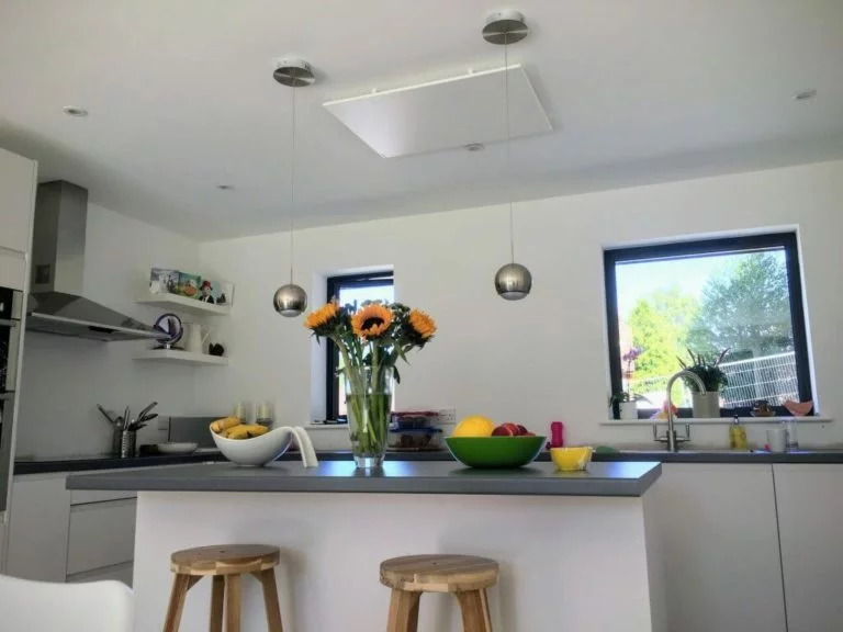 Poiché il giardino e il garage progettati per noi dall’architetto Laura Clarke come parte dell’innovativo programma televisivo della BBC 2 “Your Home Made Perfect” erano sia contemporanei che minimalisti, sapevamo di dover trovare una gamma di accessori e arredi per incontro. Di conseguenza, quando Laura ha suggerito i pannelli a infrarossi di Herschel e ci ha mostrato quanto fossero versatili, abbiamo pensato che potessero funzionare molto bene nella nostra nuova costruzione. Anche se ci piaceva l’idea di pannelli bianchi senza montatura che potevano essere controllati per adattarsi quando usavamo la stanza, sono molto meglio di quanto avessimo immaginato! Tuttavia, la cosa migliore di loro è che posizionandoli sul soffitto, non solo sono discreti, ma liberano automaticamente tutto lo spazio della parete per un uso flessibile. Il risultato è una stanza molto spaziosa e visivamente ordinata che non è solo accogliente in inverno come luogo in cui lavorare da casa, ma anche per rilassarsi la sera o nel fine settimana. Non potremmo essere più felici!